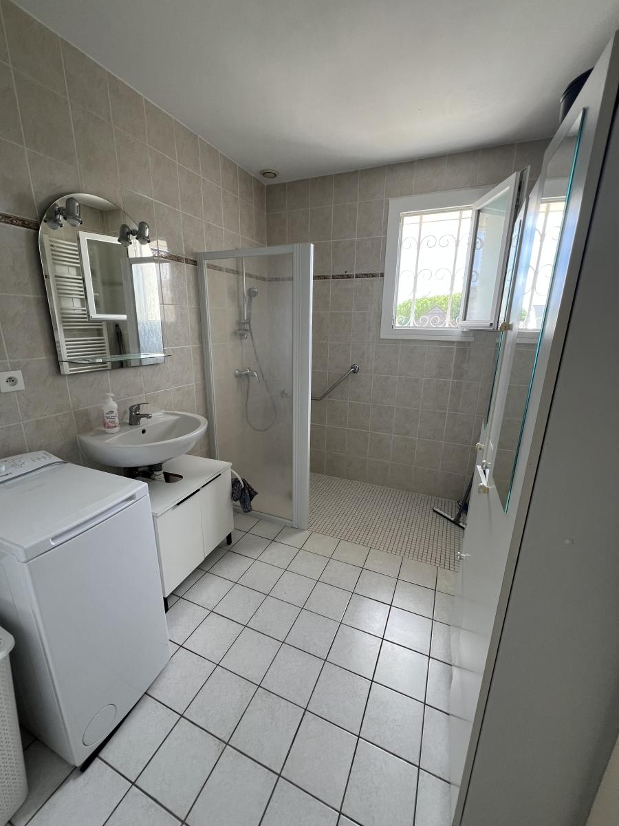 Portail PVC manuel, terrain clos de grillage, terrasse sur l’arrière située au-dessus d’une ancienne fosse à vidange, garage une voiture non attenant avec électricité et faux grenier.