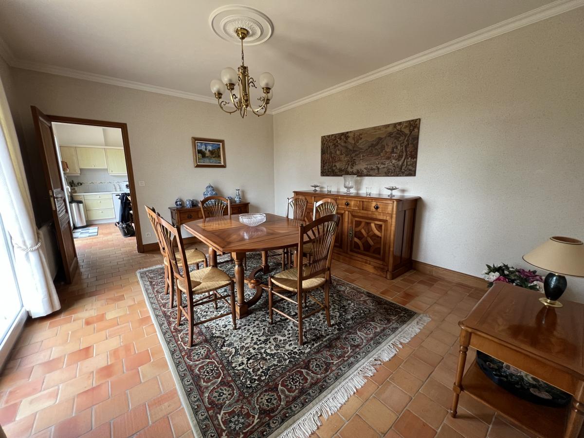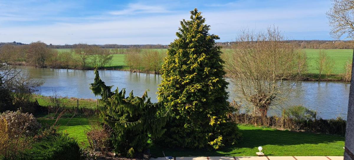 Maison vue sur le Loir de 1992 qui comprend au rez-de-chaussée une entrée, un salon avec cheminée insert, un bûcher, une salle à manger, une cuisine aménagée et équipée, un dégagement, un WC, une lingerie, une chambre avec salle de bains attenante (baignoire, douche et double vasques).