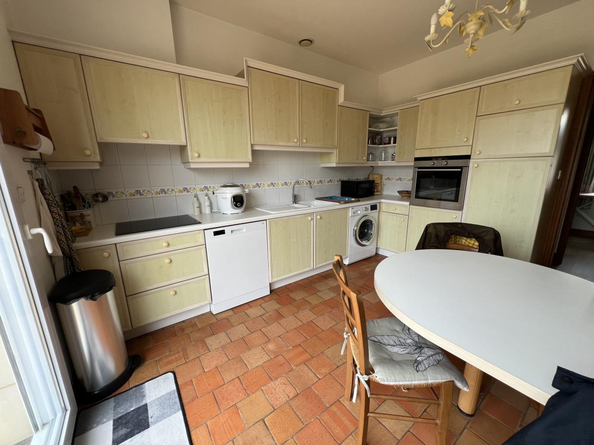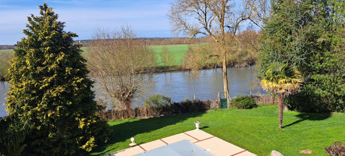 Maison vue sur le Loir de 1992 qui comprend au rez-de-chaussée une entrée, un salon avec cheminée insert, un bûcher, une salle à manger, une cuisine aménagée et équipée, un dégagement, un WC, une lingerie, une chambre avec salle de bains attenante (baignoire, douche et double vasques).